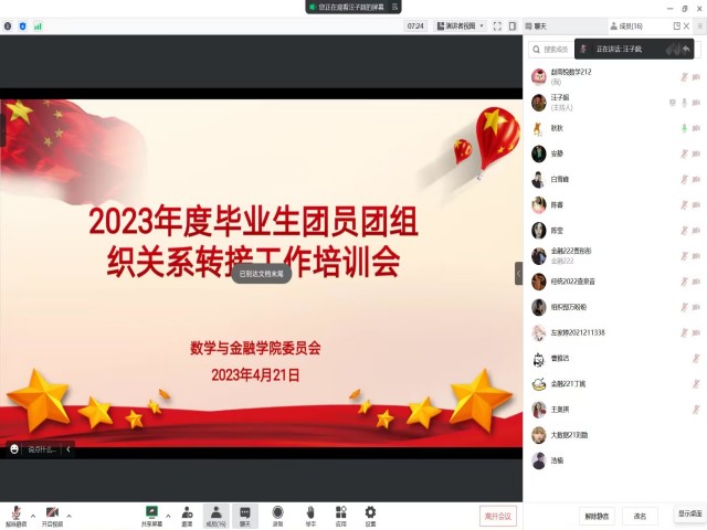 4月21日晚,金沙威尼斯官网举行2023届毕业生团员团组织关系转接工作培训会暨启动仪式。会议由团委副书记汪子超主持,团委负责人荣菁秋老师、辅导员庞玲玲老师、辅导员周绍鹏老师以及各班团支书参会。