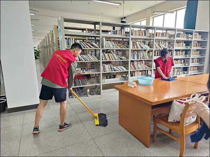 活动开始,活动负责人带队给各组分发了清扫工具和分配任务。在整个活动过程中,各个小组带着清洁工具在指定区域打扫了图书馆的书架并整理了书籍。活动结束后,负责人和志愿者将卫生工具放回原位后安静地离开图书馆。