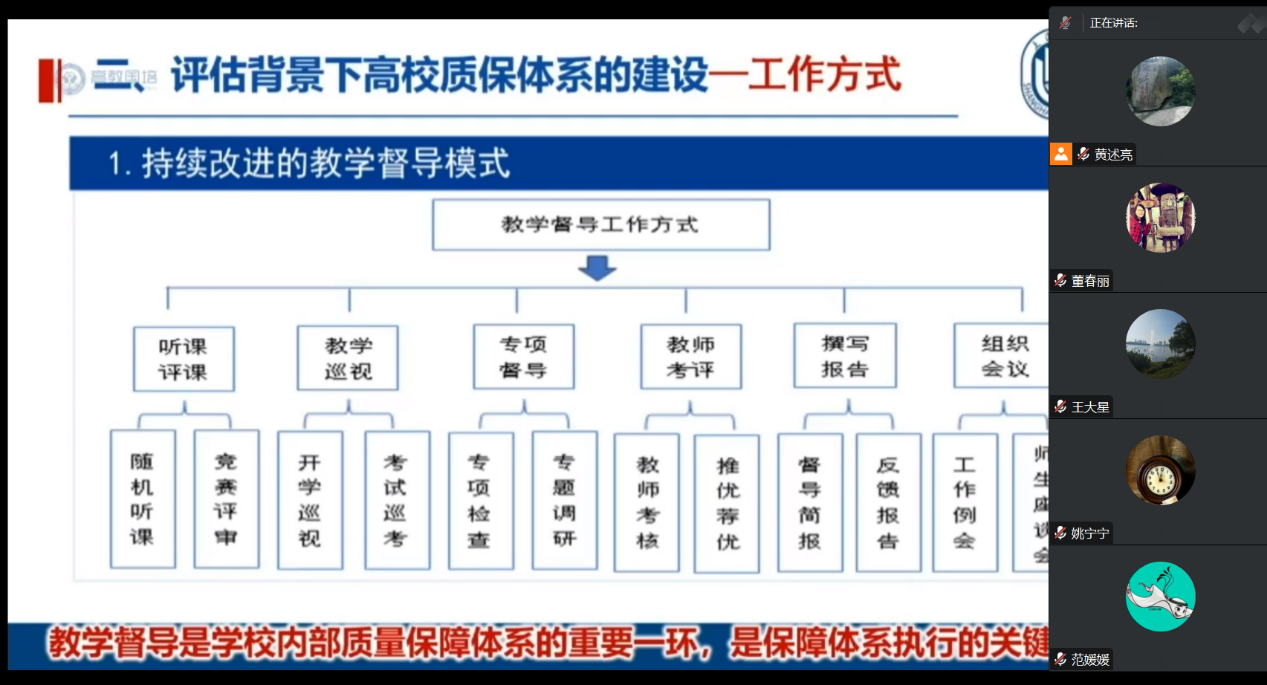 会议回顾并总结了学院前期开展的教育教学审核评估工作,对审核评估过程中督导发现的问题及“评估背景下高校质保体系建设”会议学习心得进行了讨论。黄述亮强调,要把教学督导工作和审核评估工作统一起来、统筹安排、有序衔接,确保教学督导工作为教学质量提升提供保障;要严格落实各督导环节,以审核评估凝聚力量,不断规范教学行为,切实提高教学质量;要全面突出立德树人、聚焦学生发展的理念,对人才培养方案、课程教学大纲、课堂教学质量、实验教学、实习、论文等方面开展全面检查与优化,做好人才培养、教学质量保障能力建设。