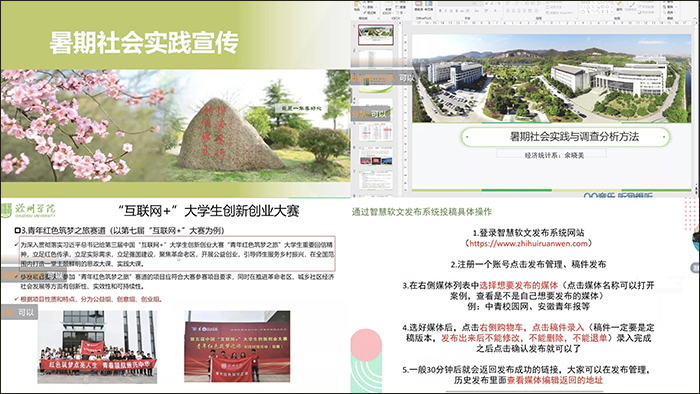 余晓美作调研报告撰写培训,她提醒同学们写调研报告需要确立思想,保证实践成果内涵丰富,给出解决方案,要对调查分析方法赋能,还要突出亮点,体现出其中的态度、创意、专业。随后,陈沭文就社会实践新闻稿对参与者进行培训,他介绍了社会实践中可能会用到的几种类型通讯的写作技巧。此外,刘博文进行验收标准和相关结项要求的培训;王静进行学院投稿要求及相关渠道分享,指明了通过智慧软文发布系统投稿的具体操作。