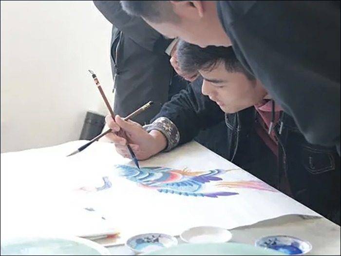 最后,工作人员带我们体验了凤画的创作过程。工作人员带我们用黑白的简单样式进行初步尝试,随后尝试添加色彩,在内容上开始慢慢增加难度。在工作人员的指导下,实践队员们第一次创作出一副副简单的凤画作品,受到了工作人员的一致好评。