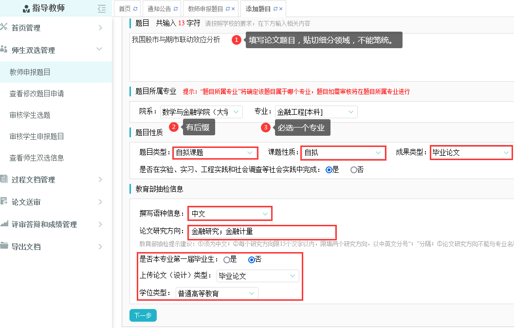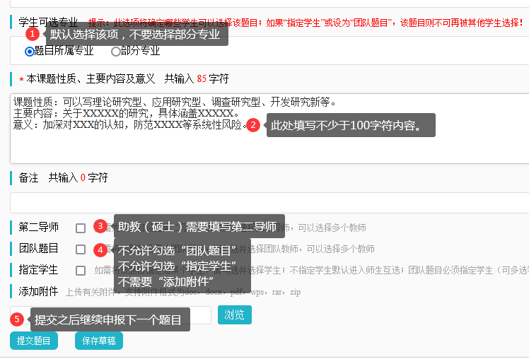 1、选题数量:硕士、助教申报6个题目,博士、讲师申报8-10个题目,副教授、教授申报10-15个题目。
