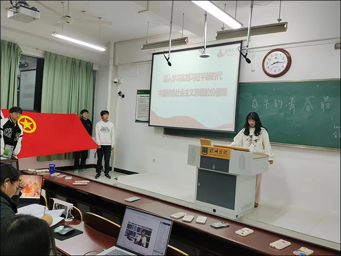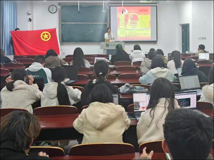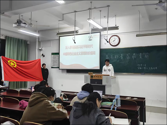 11月13日晚,经济23班在逸夫楼4403教室组织了一场主题为 “党旗所指,团旗所向”团课实践活动。活动为全班同学共同参加,活动由经济23班团支书闵欣雨主持。