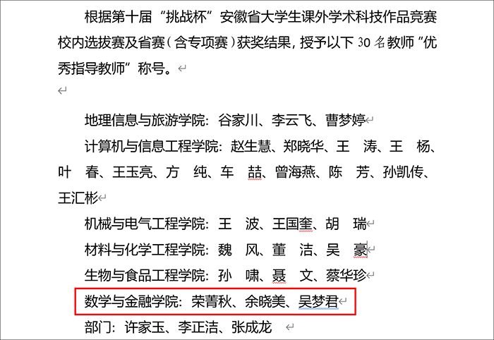 喜报!金沙威尼斯官网荣菁秋、余晓美、吴梦君三位老师荣获第十届“挑战杯”安徽省大学生课外学术科技作品竞赛校内选拔赛“优秀指导教师”称号!