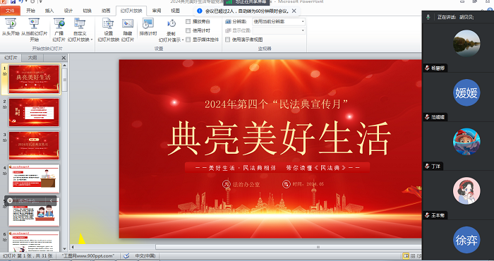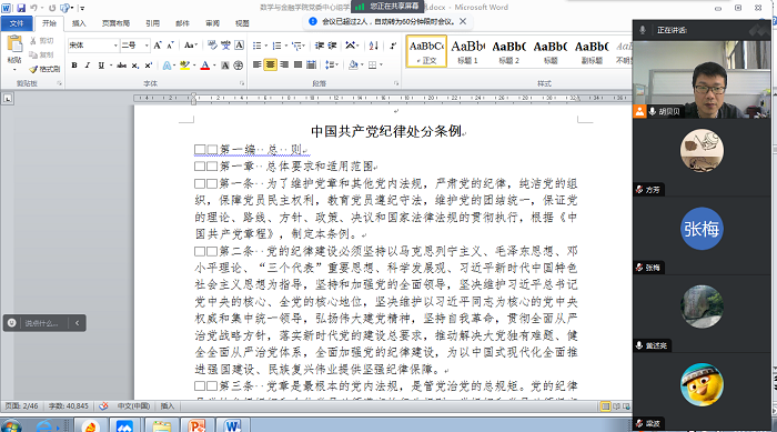 今年5月是第四个“民法典宣传月”,为深入学习贯彻习近平法治思想,增强应用数学系党支部教师的法治意识,5月29日下午,应用数学系党支部线上召开了全体党员大会,开展了党纪学习专题教育和“民法典”专题学习。