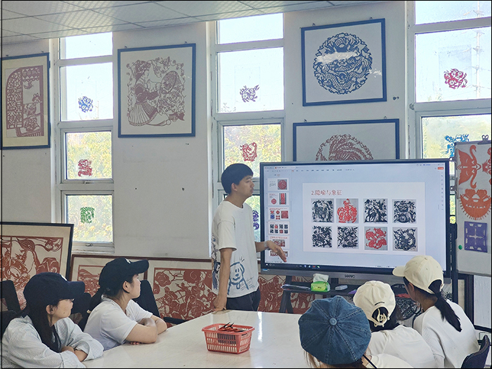 朱炳南老师作为明光市剪纸艺术大家族的第五代传承人,深受祖辈影响,为我们详细介绍了剪纸的历史渊源、技艺特点以及现代社会的创新发展。我们聆听着朱老师讲解剪纸艺术从古至今的演变过程,了解到剪纸不仅是一种艺术形式,更是中华民族文化的重要组成部分,承载着深厚的历史意义和文化内涵。