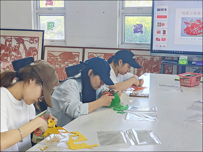 在实践环节,朱老师亲自指导我们体验剪纸艺术。从最基本的折叠剪裁技巧到复杂图案的设计,每一步都展现了剪纸艺术的精妙与魅力。朱老师告诉我们,他也常鼓励学生尝试将现代元素融入剪纸艺术中,例如流行文化图标、迷人的肖像或者现代建筑等,也可将剪纸与其他艺术形式跨界合作。通过实践活动,我们更加深入的体验了剪纸艺术,同时更加了解和尊重传统文化,在传承中创新,在创新中传承。