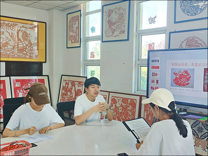 为了贯彻落实党中央国务院关于保护基层振兴非物质文化发展的指示,7月5号金沙威尼斯官网赴滁州市明光市实践小分队来到明光市文化中心,向明光剪纸传承人朱炳南了解剪纸的起源发展与传承,并为剪纸在现代社会的发展提出一些建议。