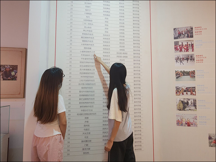 在滁州市文化馆,小组成员深入探索和学习了滁州市丰富的非物质文化遗产,文化馆的志愿者们热情接待了这些充满好奇和求知欲的学生们,并向他们详细介绍了滁州市非物质文化遗产保护的现状、非遗项目、非遗传承人以及非遗的保护传承的重要意义。学生们在展厅的非遗互动屏前驻足,认真观看非遗视频及文字说明,学习非物质文化遗产保护知识,体验非遗文化的魅力。