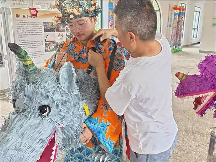 在我们下午到达目的地时,我们实践小队有幸得到进行文化传承的机会,我们在老师傅的帮衬下成功穿上对应刘备,诸葛亮以及“云”的服饰,随后我们手上也是拿上各自须带的物品,在老师傅的指导下我们开始学习简单表演,但由于实践以及人数的关系我们没有进行真正的表演,这对于我们也是比较可惜,希望下次有更多的大学生可以来到此处,但我们也更加了解这个非遗文化。