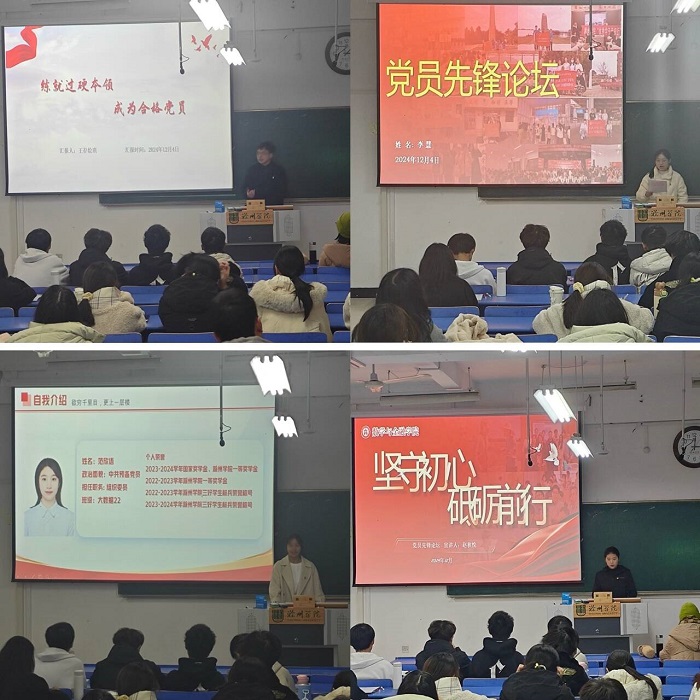 赵秋悦等四名优秀学生党员依次在论坛上报告了自己大学几年的学习、生活和收获,以及自己党员先锋模范作用的发挥。他们纷纷表达了几年的成长离不开学校、学院的教育培养。赵秋悦同学告诉全体入党积极分子,入党积极分子是党的后备军,青年一代要坚定理想信念,练就过硬本领,敢于担当作风。王存烩琪同学倡议大家以党员的标准要求自己,做到不违纪、不挂科、不旷课,要身体,要坚定,要本领。范欣雨同学倡议大家树立远大理想,努力学习知识,培育自主学习,开拓思维视野。李慧同学倡议要不断学习党员标杆,坚定政治立场,严格遵守纪律,做好先锋表率。