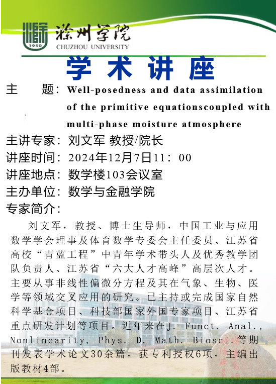 【学术讲座】刘文军:Well-posedness and data assimilation of the primitive equationscoupled with multi-phase moisture atmosphere