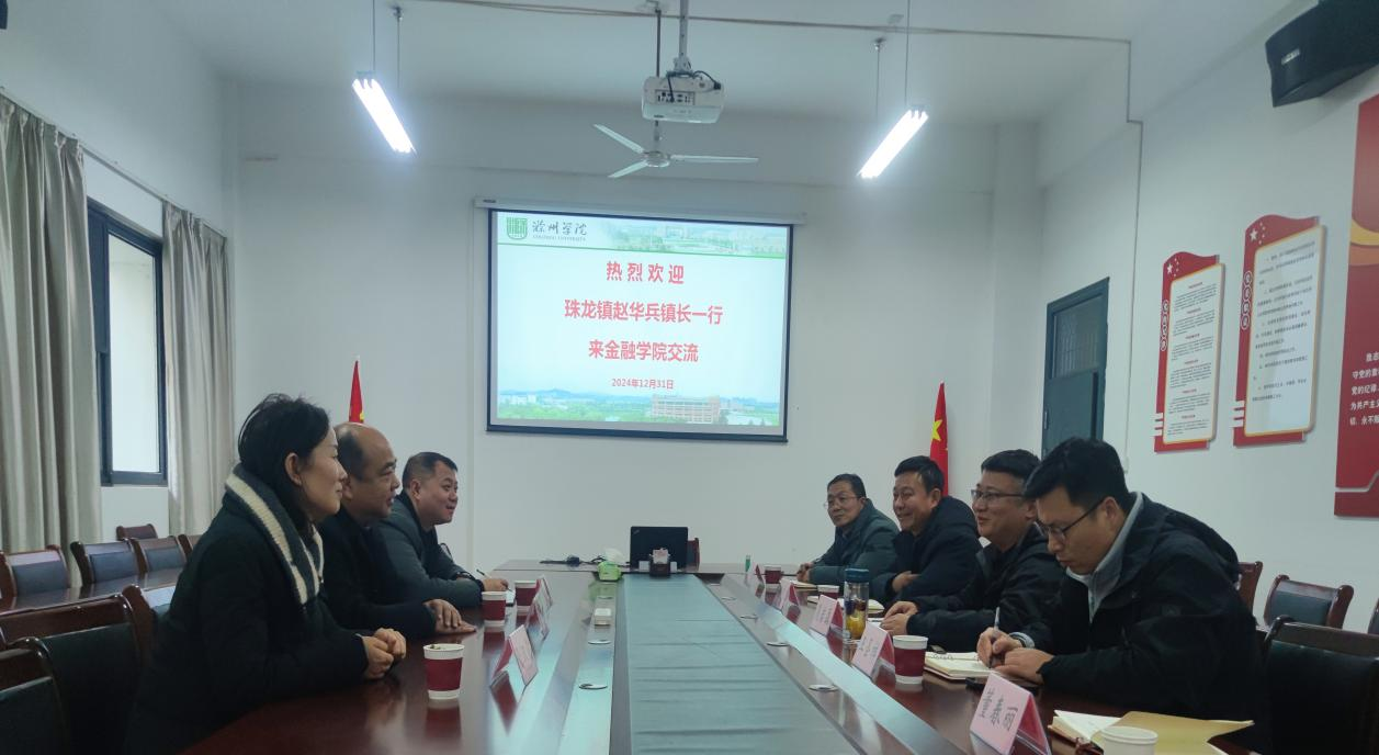 2024年12月31日,南谯区珠龙镇副书记、镇长赵华兵一行来院洽谈产学研合作事宜。金沙威尼斯欢乐人城院长夏岩磊、副院长王圣祥等热情接待了赵华兵一行。珠龙镇党委委员徐礼浩、张汉霞,以及我校文学与传媒学院院长晋秀龙、金融工程系主任桑利恒、专业骨干教师董春丽等参加了商讨。